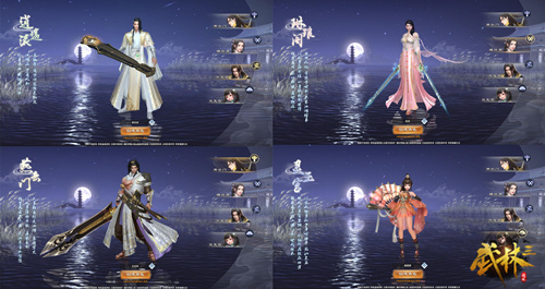 《武林三》一共有4个职业可以选择,分别是:逍遥派、灵玉宫、燕云门、琳琅阁。武器分别是:逍遥—琴、灵玉—扇子、琳琅—双剑、燕云—大刀。说实话,游戏职业的平衡性太棒了,完全没有任何区别,只是技能效果和角色形象不一样,各位选择就看各位爱好吧。