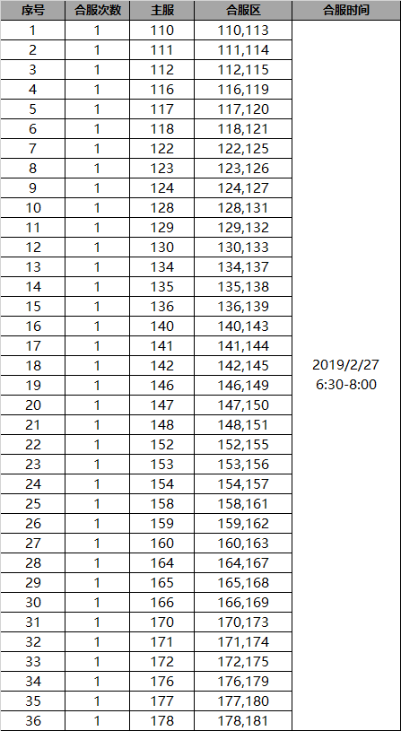 为了给您提供更好的游戏体验和感受,我们将在2019年2月27日对部分服务器进行合服操作,合服时间会因为数据量大小提前或延迟。服务器合服后,原服务器入口依然保留,参与合服的玩家依然可以选择老的服务器名进行进入。(