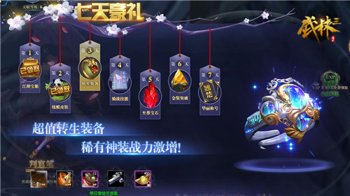 村上春树曾说过:“如果我爱你,而你也正巧爱我,你头发乱了的时候,我会笑笑的替你拨一拨,然后,手还留恋的在你发上多待几秒……”但如果有一个陌生人么,一连七天送你不同的礼物,试问各位女生会接受还是拒绝呢?要是问小编,我会回答:只要是《武林三》送的就一定会接受!从宝箱到皮肤,再到转生装备和华丽称号,一连七天没有一个重样儿的,来了就能拿!