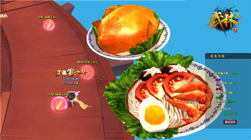 俗话说民以食为天,大多在游戏中修炼的武林人表示能活这么大全凭一口仙气,你在游戏里是看不见他们拿着大包子在路边摊啃的,所以身材都很苗条。《武林三》偏要和别人不一样,每天14:00-14:30半小时美食天地让你吃个爽!在这里你可以看到经典的美食,色香味俱全的东坡肉,清爽可口的拉面,还有漫天飞舞的烤鸭!对,你没有看错,就是烤鸭!鸭子大了,也要到外面的世界逛一逛,所以各位玩家只能采集食材来制作自己的美食了。