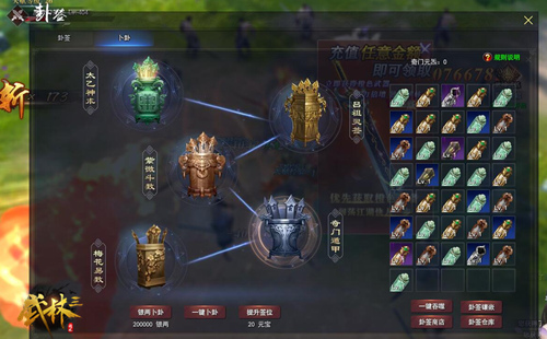 开启系统后,我们率先会进入卜卦页面,因为需要收集卜卦产生的卦签,再将其应用到卦签页面当中,增加装备属性加成。卜卦卦签分为太乙神术、吕祖灵签、紫微斗数、奇门遁甲和梅花易数5种,玩家可花费银两卜卦随机获得卦签。卜卦等级越高,获得高品质卦签的几率也就越高。如果觉得自己运气不好,也可以花费20元宝提升签位,当然代价就是花费更多的银两了,所以需要玩家在前期多参与可以获得银两的副本和活动,积累财力。