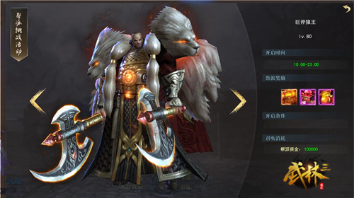 蛮兽入侵是360《武林三》帮派活动里参与人数颇多的一项活动,每天由帮主或副帮主消耗一定资金才能开启,也就是说没有各位帮助大大的首肯,帮派成员是无法参与活动的哟!活动开启时间为每天10:00——23:00,达到58级以上即可参与。BOSS分为不同等级,从80级开始,玩家可以从凶猛彪悍的巨斧狼王开始挑战,前提依然是帮派等级足够高的情况下,可以挑战的BOSS难度也就越高,获得优质奖励的机会也就越大。
