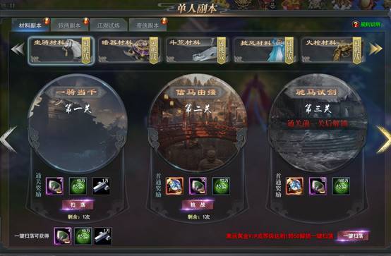 副本具有诸多关卡,每一关都有一定数量怪物需要击杀,规定时间内击杀全部怪物即可过关。通观后可进行扫荡。