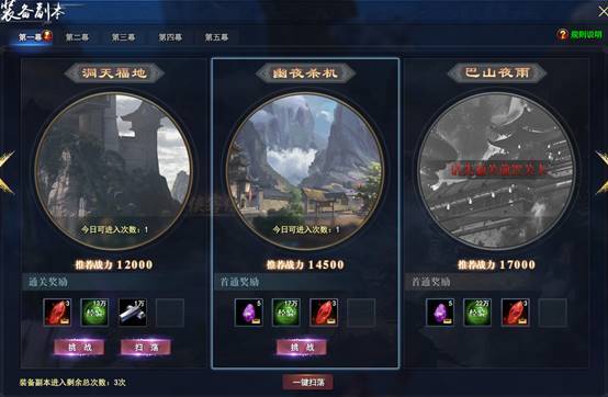 装备副本共分为五幕,每一幕分为5个副本,通过前置副本可挑战下一副本。