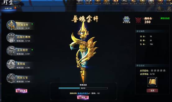 收集散落在江湖各地的珍宝碎片,通过消耗各类珍宝碎片对传世珍宝进行修复,修复珍宝达成一件以上即可激发珍宝连锁,可大量提升自身属性,增加战力。