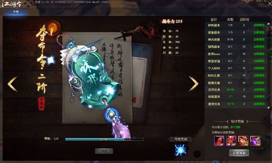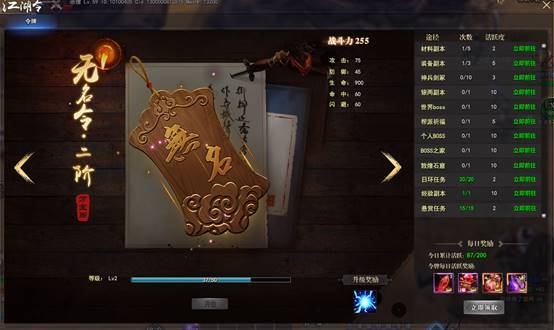 由游戏内权威机构万宝阁颁发给江湖侠士,通过完成对应途径来获取活跃度,活跃度满即可对令牌进行升级,获得相应属性加成和升级奖励,级数越高身份令牌越为尊贵,江湖地位越发高贵。