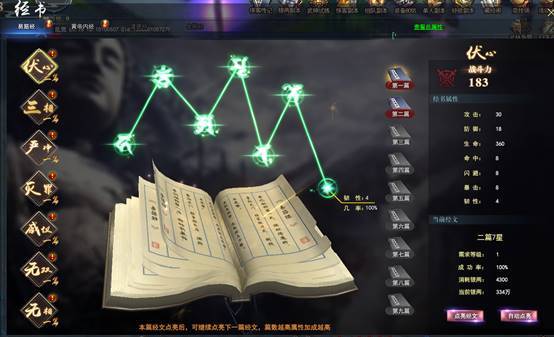 当玩家达到一定等级的时候即可开启经书系统,进行经书点亮,点亮经书需消耗一定银两,有一定几率会点亮失败,点亮成功即可增加人物对应属性,全篇点亮即可获得大量属性加成。