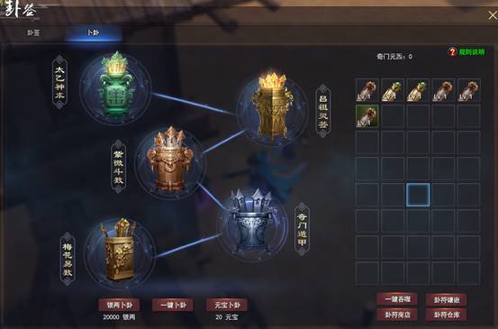 玩家可在卜卦界面消耗银两进行卜卦获得卦签,可通过吞噬其他卦签对卦签进行升级,可在卦签商店使用低品质卦签兑换高品质卦签。