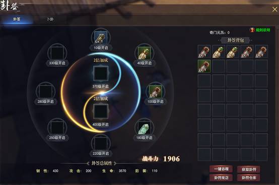 玩家达到一定等级可开启卦签系统,装备不同属性卦签可对相应属性进行加成。